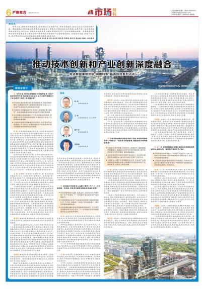 编者按: 今年以来,国际油价宽幅震荡,国内炼化行业内卷严重,市场竞争激烈,炼化企业生产经营形势严峻。围绕集团公司炼化板块全年各项目标任务,《市场导刊》策划推出系列访谈,从研产销一体化角度邀请部分研究院、炼化企业、销售企业相关负责人梳理贯彻落实年中工作会议精神的思路。首期邀请部分研究院科研管理负责人围绕如何加快推动技术创新和产业创新深度融合、加速技术突破、助推产业升级、充分释放炼化板块创新驱动效能建言献策,敬请关注。 本版文字由本报记者 雷 蕾 陈子佩 孙宝翔 潘亚男 周梦瑾 通讯员 高旭锋 刘蕙心 采访整理 问:今年以来,研究院围绕服务国家战略需要、引领产业深度转型升级、快速响应市场需求,重点在哪些领域进行了攻关研究?取得了怎样的成果? ?石科院在强化标准引领、攻关氢能技术、研发可再生燃料、发展循环经济方面取得显著成果,炼油、化工、石油产品领域技术实现突破与应用。 ?大连院在引领重油加工技术进步、推进高价值“油转特”、快速突破新能源与新材料技术方面取得成果。 ?北化院着力突破关键化工工艺与材料技术瓶颈,国家重大科技专项研究获进展,且多项技术实现工业应用或装置落地。 ?上海院承担多项国家级项目的同时,在支撑油气企业增储上产、炼化企业提质增效及产业链延伸升级方面取得技术突破与应用成果。 林 伟:在服务国家战略需要方面,石科院强化标准引领,入选国家标准化管理委员会国家标准验证点(第二批)名单,成为石油产品领域唯一国家标准验证点;牵头制定石油计量领域国内首个ISO标准《ISO 23505 石油和液体石油产品—球罐标定—光电外测距法》;攻关氢能领域核心技术,国家自然科学基金企业创新发展联合基金“高效分布式制氢集成技术的基础科学及工程问题”通过基金委结题验收;开展可再生燃料研发,生物航煤发展战略中国工程院重点咨询研究项目荣获“优”级评价,HEFA路线生产可持续航空燃料取得重大突破;聚焦循环经济发展,废塑料化学循环技术示范项目实现工程竣工。 在快速响应市场需求方面,石科院在炼油领域,PS-VIII高密度连续重整催化剂创造430万吨/年最大规模应用新纪录;重油催化裂解(RTC)技术两套300万吨/年装置在镇海炼化开车成功,已连续稳定运行超1000小时。在化工领域,变革性己内酰胺成套技术整体达到国际领先水平;流化床双氧水绿色生产成套新技术在湖南石化完成装置改造,有力支撑了我国双氧水技术迭代升级。在石油产品领域,C2/C6/SQ/GF-7内燃机油复合剂技术实现首次许可。 王 刚:大连院一是实现百万吨级“沸-固”复合床渣油加氢技术工业化,引领重油加工技术进步。世界首创“沸-固”复合床组合工艺,实现渣油加氢处理效率的能效倍增,280万吨/年工业装置于6月在镇海炼化实现工业平稳运行。广州石化、九江石化百万吨级复合床装置进入工程设计阶段,福建古雷炼化百万吨级沸腾床装置成功入龙。 二是聚焦高价值“油转特”,成功研发高端针状焦、负极材料专用焦等特色产品,助力集团公司上半年高端碳材料继续保持强劲发展势头。直径700毫米石墨电极用针状焦实现进口替代,接头焦打破国外技术垄断。以高硫石油焦为原料实现高比能钠电硬碳负极材料制备,正在建设200吨/年中试装置,助力集团公司延伸碳产业链。 三是新能源、新材料技术快速突破。加大战略性新兴产业、未来产业布局和攻关力度,推动生物制造、绿氢制备、储能等领域取得实质突破。生物制造原创技术策源地建设快速推进,500吨/年非粮糖平台建成投用,加快生物制造技术工业应用进程。建成国内首个工厂化海水制氢中试装置并长周期运行。建成年产10万平方米PEM碳纸中试生产线,打破国外垄断。在河北石油建成石化行业首个百千瓦铁铬液流电池储能系统,低成本实现液流电池储能。 郭子芳:在服务国家战略方面,北化院积极参与国家重大科技专项研究,在研的牵头承担项目和参与项目取得重要进展。 在推动科技成果转化方面,50万吨/年聚丙烯釜内合金工业装置在镇海炼化建成并开车;新型BCC催化剂、茂金属聚丙烯PL01催化剂、BSQ-Ⅱ催化剂、DQS-H2催化剂等实现工业应用,茂金属聚乙烯EG01催化剂完成工业生产; 6万吨/年PBST工业示范装置在海南建成并投产;20万吨/年气相聚丙烯技术在洛阳石化成功落地;5万吨/年乙烯四聚技术在茂名石化建设装置;长玻纤增强聚丙烯技术在青岛炼化建成装置并顺利开车;丙烯基弹性体(PBE)技术建成国内首套中试装置,并生产出两个新牌号;高端动态硫化热塑性弹性体(TPV)完成4个牌号的中试及下游验证,成套技术将在金陵石化落地;新型BHL聚乙烯催化剂在中科炼化实现工业应用,填补了国内相关领域的空白;开发的废旧PET醇解技术,已完成万吨级工艺包编制。 齐国祯:聚焦担当国家战略科技力量核心职责,上海院积极承担国家科技重大专项、国家重点研发计划、国家自然科学基金项目。持续加强高性能碳纤维技术攻关,积极推动产品下游应用验证。 聚焦产业发展需要,上海院在支撑油气企业增储上产方面,研发的超高活性阴阳离子表面活性剂在高含水、高采出老油田应用,日产油大幅提升;耐温泡排剂破解了超深气井难题,打破6800米泡排世界纪录,成功复产元坝气井;针对低渗油藏特点,开发了新型微乳液解堵剂,在胜利油田、中原油田