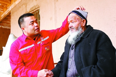 斯尔江? 托合提木拉提(左),中共党员,1977年出生,西北油田采油一厂采油管理一区主管,第三届“感动石化”人物。 四处奔走募集良方,只为让山梁洒满阳光。 烧的煤,吃的米,缸里的水,样样都是你的牵挂。 用心浇灌民族之花,你挽起袖管,脱得下鞋子,钻得了家田。 你这支拐杖,是孩子们的翅膀;一副双肩,扛住了生命的重量。 敬礼,献给“访惠聚”路上大写的你!