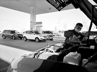 内蒙古乌海石油增加冬季服务项目,推出玻璃水加注、热饮供应、冬季洗车等特色服务。2020年12月,乌海石油市区加油站汽油销量、非油品销售额均同比增长。图为北环路加油站员工在为顾客加注玻璃水。 田开丽 摄