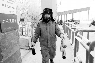1月初,春光油田气温降至零下25摄氏度。河南油田油服中心西部运行大队党员干部员工坚守生产一线,战严寒保上产,以奋进的姿态力争一季度生产经营开门红。 图1为在春10热采区块,西部运行大队组织机关党员干部回收落地原油。 图2为员工送油样归来。 乔庆芳 摄 刘亚日 文
