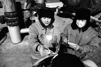 日前,寒潮侵袭全国多地,给一线生产带来挑战。为保障原油顺利进厂,齐鲁石化检验计量中心员工不畏严寒、不舍昼夜,奋战在计量生产一线,做好液位高度、油温等测量和现场巡检工作,全力把原油损耗量降到最低。图为1月6日晚,检验计量中心第一计量站计量员检查胜利原油铅封。 陈 强 摄