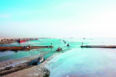 ?1月11日清晨,胜利海港内港池破冰船舶清理航道,海洋采油厂生产运输船舶依次驶出码头,前往埕岛油区。 陈 杰 摄 李 伟 文