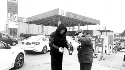 连日来,气温骤降,陕西咸阳市武功县出现车辆加气排队现象。作为该地区唯一的CNG加气站,咸阳石油武功加气站员工积极应对,做好车辆疏导和服务。图为该站员工为司机加热水。 袁亚琴 摄 王海峰 文
