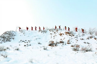 刘 行 沈志军 孙刚刚 张广虎/图 程 强 王一冰 屈 冰 王文茂/文 (一) “君不见走马川行雪海边,平沙莽莽黄入天。” 古尔班通古特沙漠腹地,气温将近零下30摄氏度, 寒风掠过,真正是“风头如刀面如割”, 胜利分公司SGC2105队给设备“穿上棉衣、盖上棉被”。 放线队员背着几十公斤重的采集设备, 走一步滑两步,翻越沙丘,一天3万步是家常便饭, 饿了就吃点自带干粮,累了就在雪地上撒个野。 雪地上,除了物探人的大脚印, 便只有骆驼、黄羊、野兔、野鸡的零星足迹。 即便枯燥、单调,他们依然爱着这片冰雪沙漠, 放线班班长王延君扬起一把雪沙, 美好的心情纷纷扬扬。 (二) “黄天厚土大河长,沟壑纵横风雨狂。” 陕北的黄土塬上,红工衣点缀其间。 华北分公司SGC2116队和南方分公司工程物探中心联合作战, 共同解决黄土塬地震资料采集世界级难题。 他们优化井炮组合,动用7种钻机,穿越千沟万壑。 从最难干的羊泉项目中间共用排列区域干起, 约定以零时为界,各放炮6小时, 这相当于把两人的一条腿绑在一起跑步, 快的一方要给慢的一方延长一些放炮时间, 放炮进度同步,才能实现效率、效益最大化。 副队长申利军写下《羊泉赞歌》: “天寒地冻敢担当,血气方刚好儿郎!” (三) “山,刺破青天锷未残。天欲堕,赖以拄其间。” 世间山川绝美处,往往也奇险异常。 重庆石柱南工区,有7个无人区,1万多个悬崖陡坡, 武汉勘查公司SGC2127队逢山开路、遇水搭桥。 山下苍翠欲滴,山顶白雪茫茫, 找油人挑着钻机、背着线缆,孤独而艰难地跋涉。 孤岭崎岖路,人迹罕至处, 他们设立临时支撑点,确保线路通畅。 项目经理、武汉勘查公司采集专家周拥军感慨: “冬日游,雪花吹满头。岭上谁家儿郎,逐风流!” (四) “朔风搅长林,凝冰封厚地。人嗟行路难,君行亦易易。” 黄河三角洲,北风呼啸,寒潮侵袭,千里冰封龙悦湖。 胜利分公司滩海业务中心物探队员顶风冒寒, 冰上行舟,凿冰挖洞放线忙。 他们要赶在龙悦湖完全冰封前完成第二轮施工。 广利-青南、王家岗、八面河项目是东部探区首个一体化项目, 复杂地形多、施工难度大,需要陆、海、滩三栖作业。 芦苇荡的烂泥地、海上的十级大风、冰封的大湖, 难不倒这群战天斗地、滩浅海作业经验丰富的物探队员。 半个多世纪过去,黄河三角洲上, 会战号角依然嘹亮,石油精神永续传承!