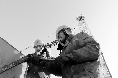 胜利油田油气井下作业中心东辛作业区开展“我为安全作诊断”隐患排查活动,并加大安全诊断的奖惩力度,调动各岗位员工查隐患保安全的积极性。图为1月18日,作业区班组员工在检查紧固井架绷绳。毕国平 摄 石 城 文