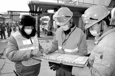 沧州炼化施工现场按照“一把手”承包制度进行管理,制定“监护十查”卡片,实行施工作业分级管控。严格承包商及关键环节管理,采取随机检查和视频抽查方式,对施工现场实施督查。图为1月18日,热电部安全管理人员、现场安全监督员及施工方管理人员按照规定填写作业票。 于铁洪 摄 伏铁刚 文