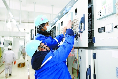 镇海基地净化水场项目占地面积2.4万平方米,建设内容包括混凝沉淀、过滤消毒、给水加压设施及变电所、机柜间等配套设施,建成后具备13.5万吨/日的生产水净化处理能力。目前,该项目土建、地管工程和钢结构安装已完工,36台主要设备均安装就位。图为施工人员正在进行变电所仪表接线作业。 陈卫民 华 赟 摄影报道