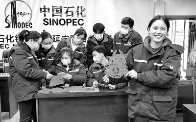 1月30日,陕西延安石油举行“剪纸迎新春”活动。图为员工展示剪纸作品。呼延月心 摄
