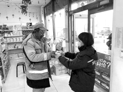 近日,山西太原石油50余座加油站同步开展了爱心活动,为辛勤工作在户外的环卫工人、执勤交警、出租司机、快递人员送热粥,让户外劳动者感受温暖,并传递中国石化的关怀和祝福。图为太原石油加油站员工为环卫工人送热粥。 任 华 秦晓耕 摄影报道