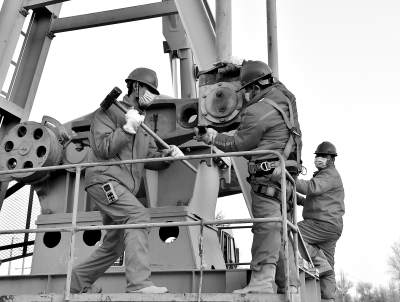 1月份以来,西北油田采油三厂不断增强产量意识和责任意识,制定了安装搬迁作业“三提早”措施,即提早办理上传各项手续及作业票、提早查看现场、提早准备各类对口工具。目前,两天才能完成的工作量不到1天就完成,作业质量和施工时效得到“双提升”。图为采油三厂管理二区员工在TP204井安装抽油机。罗丽娟 摄