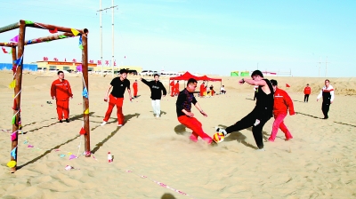 ?2月13日,西北油田采油四厂试采新基地门外沙滩上,“喜迎新春”沙滩足球赛精彩开战。双方队员互不相让,奋力拼抢,呐喊声、欢呼声让节日的氛围更热烈。朱清峰 摄
