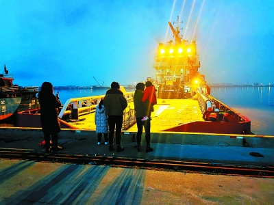2月11日,胜利油田胜利292船接到外闯市场任务,要去大连庄河完成风电项目。温暖的灯光拉长了家人的身影,流露出丝丝不舍,期盼船员们圆满完成任务,早日返乡。 崔舰亭 摄