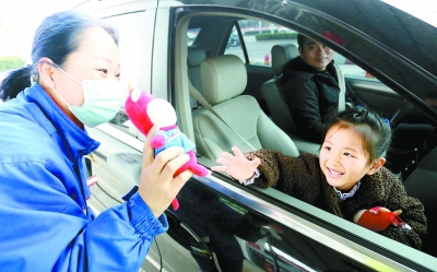 2月11日,江苏南通石油虹桥加油站里,站长周颖给“小顾客”赠送福牛娃娃,孩子灿烂的笑容温暖了员工的心。 张白峰 摄