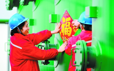 2月10日,华东石油局泰州采油厂帅垛班站员工将鲜艳的“福”字贴在设备上,为现场增添浓浓年味。沈志军 王小琴 摄影报道