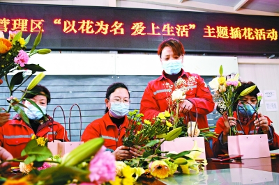 在“三八”妇女节来临之际,胜利油田现河采油厂郝现采油管理区女工委以“以花为名 爱上生活”为主题,开展插花活动。乔 晨 摄