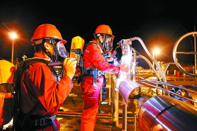 西南油气分公司采气二厂贯彻落实百日安全无事故专项行动要求,抓实现场班组管理和安全巡查,确保元坝气田安全平稳生产、保持高位运行。截至3月9日,今年累计生产天然气7.97亿立方米。图为元坝气田员工夜间巡查采气流程管线电伴热保温情况。
