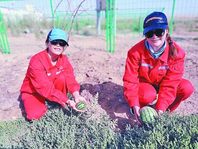 去年,项目部除了栽种红柳,又在营地周围撒下苜蓿种子。大家坚持浇灌,苜蓿种子发芽了。令人惊喜的是,地里居然还长出了一棵西瓜秧。大家天天去照看,生怕它夭折。