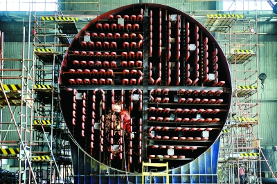 2021年上半年,炼化工程集团宁波工程公司承制设备交付期集中,该公司制造板块两地四厂、厂内与现场多点并进,组织作业队伍掀起新一轮施工高潮,抓紧境内境外、系统内外重点项目非标设备制造加工,确保所承制各类设备如期履约交付。上图为该公司镇海大件码头制造车间,下图为作业工人正进行设备内部构件组对安装。本报记者 张见明 摄