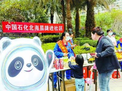 近日,广西北海石油组织机关人员和加油站人员开展“易捷进社区”营销活动,结合套圈、抽奖等趣味项目,向社区顾客推介“易姐姐·螺蛳粉”、良大头油米、易小果等热销的非油商品,并积极推广微信加油卡、冬奥卡等,吸引客户驻足。活动当天,该公司售出近百件非油商品。图为员工向社区居民推介易捷便利店非油商品。张 荟 摄