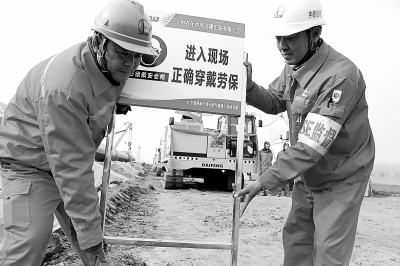 中原油建工程有限公司开展百日安全无事故专项行动,在施工现场安全管理中,要求安全措施不完善不施工,确保安全设施配置合格,达到安全施工标准后才允许施工。图为3月15日,公司安全人员在施工现场设置安全警示牌。 张 鹏 摄 娄凤岭 文