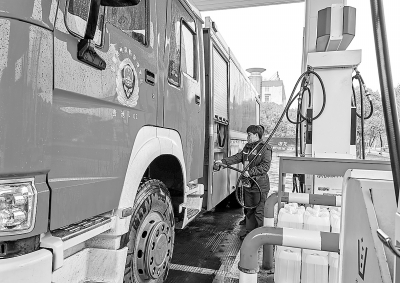 近日,安徽池州石油将位于市区的新区加油站指定为军警特种车辆用油保供站。该站不仅设置了专用通道,而且配置了专用油枪,为特殊车辆加油提供便利。图为新区站员工为消防救援车加油。孙宗奎 摄