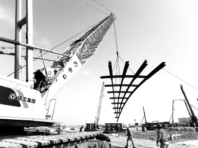 3月22日,四建公司承担的天津LNG二期项目5号、6号储罐第一片钢制穹顶骨架顺利完成预制下胎工作,标志着钢制穹顶预制工作正式展开。 据介绍,该片钢制穹顶骨架总重29.5吨,四建公司项目部精确计算设定吊点,仅用3天就完成预制下胎任务。图为项目施工现场。 曲照贵 摄 高 鑫 文