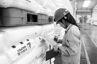 3月15日,中安联合首批500吨出口巴基斯坦的聚丙烯产品PPH-T03开始装车,这是该公司聚烯烃产品首次打入国外市场。图为中安联合员工在产品仓库进行数量统计。赵天奇 摄