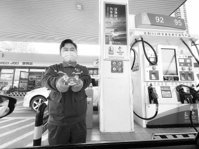 北京石油大兴黄村加油站是北京首座冬奥形象加油站,加油站形象改造完成后,以焕然一新的面貌为广大车主提供洁净油品保障。图为3月24日,大兴黄村加油站员工在向顾客介绍中国石化冬奥纪念版加油卡。刘 行 摄