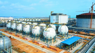 3月31日,中科炼化丙丁烷球罐区和低压火炬中交。球罐的建成不仅有利于裂解装置进料轻质化,还为整个炼厂长周期平稳运行提供了充分的物料存储与缓冲保障,标志着轻烃商储基地的建设进入新阶段。图为丙丁烷球罐区现场。 林江海 摄 张 欢 苗 准 文