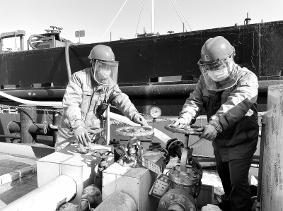 3月22日, 南化公司将960吨稀硝酸装上“浙黄机828号” 海轮,运往南方市场。这是该公司稀硝酸产品首次走出长三角,实现远距离销售。图为南化公司员工正在进行稀硝酸装船作业。裴 昱 张 炜 摄影报道
