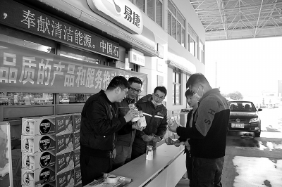 图2:在中国石化质量日到来之际,4月1日,安徽蚌埠石油加油站利用LED显示屏、横幅、咨询台等,为客户开展油品咨询和答疑解惑,提升中国石化品牌形象。图为质检人员在太平岗加油站为司机讲解油品质量知识。贺建阳 摄 徐 妍 文