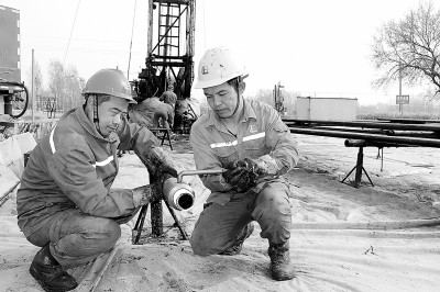 图3:河南油田油服中心在施工各环节严格执行施工环保标准、计量标准和质量标准,力争施工优质率达98%以上,一次施工合格率达100%。图为3月30日,在河南油田双浅5井施工现场,员工调试旋塞阀,确保施工一次成功。鲁海涛 摄