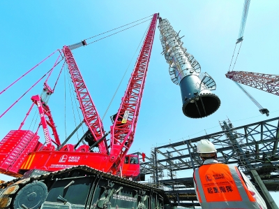 4月6日,镇海基地丁二烯抽提装置汽提塔吊装就位。该项目是镇海基地配套生产装置之一,采用中国石化乙腈法丁二烯抽提技术生产聚合级丁二烯产品。此次吊装的汽提塔直径4.2米、高度66.9米、吊装总重量320吨,采用2000吨履带吊机主吊、350吨汽车吊遛尾共同作业。目前,该项目剩余大件设备正按照吊装施工网络有序推进。图为汽提塔吊装现场。陈卫民 华 赟 摄影报道