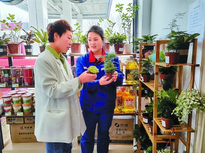 3~4月,江西景德镇石油以春季出行为主线,开展“和煦春风踏青礼”主题营销活动,各门店引进新鲜绿植、盆栽花卉进行销售。会员用户持加油卡单笔消费汽油满200元可获得一张价值5元的绿植花卉现金抵扣券,单笔购买绿植花卉可叠加使用5张抵扣券,受到欢迎。图为昌江站前站员工帮顾客选购绿植。周丽洁 摄