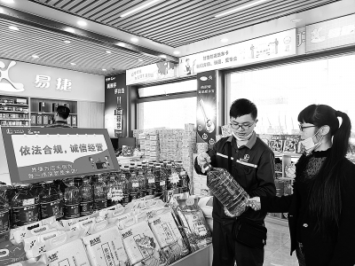 近日,广西钦州石油以客户为中心、以合规为基础、以问题为导向,指导加油站查摆问题、制定措施、促进整改,切实做好依法合规、诚信经营工作。截至目前,钦州石油查摆问题50个,问题整改率100%。图为二桥加油站员工向客户推介良大头花生油。翟恒芳 摄