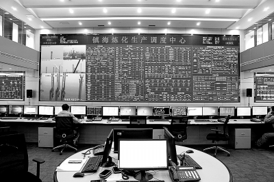 镇海炼化以“分子炼油”为核心实现炼化一体化全流程优化。建立涵盖61套炼油装置、33套化工装置的全流程炼化一体化优化数字孪生平台,包含21项全流程和116项单装置优化方案等。综合市场价格因素,利用模型可快速计算出最优加工流程控制参数,实现全流程生产方案和效益最佳。 镇海炼化生产调度中心。万 里 摄