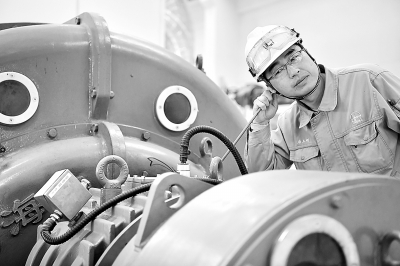 日前,在第三届“扬州工匠”评选中,仪征化纤公司PTA部PTA装置的主任技师唐玉刚获得“扬州大工匠”荣誉称号。他扎根PTA装置26年,所负责的科技创新项目多次获奖,为装置的安全稳定优产和节能环保作出了贡献。图为4月26日,唐玉刚对PTA装置余热发电机组进行特护巡检。刘玉福 摄
