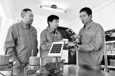 中原油田石油工程技术研究院加强在新能源领域的科研攻关,将使用传统能源的设备改造为新能源供能。图为4月26日,该院测试与节能技术研究中心科研人员攻关第三代太阳能非承载式功图遥测系统。陈 涛 摄 魏晓梅 文