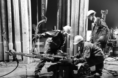 图为40587钻井队员工正在进行顾桥3-2井下套管作业。