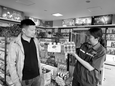 近日,安徽阜阳石油开展购易捷咖啡瓶装饮料赠卓玛泉活动,客户购买任意一组美式、拿铁、燕麦等咖啡饮料,可获赠6瓶卓玛泉,深受欢迎。图为北环路加油站员工正在向客户介绍促销活动。于海玲 摄