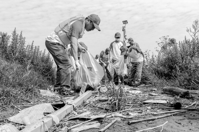 6月2日,中韩石化青年志愿者在化工厂区取水口长江段开展“长江大保护”公益活动,清理江边回流垃圾150多公斤,用实际行动助力美丽中国建设。图为志愿者在长江边捡拾垃圾。付 松 摄 张文浩 文