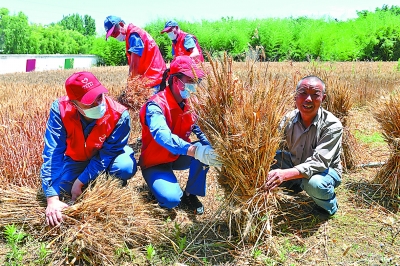 近日,河南进入“三夏”农忙时节。南阳石油组成青年党员服务队,主动帮助18户五保户抢收麦子,解决他们在“三夏”农业生产遇到的困难,并送去慰问品。图为6月4日,南阳石油宛城青年党员服务队帮助宛城区詹庄村五保户收小麦。 姜明武 摄