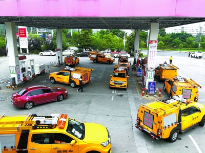左图为发展大道加油站开辟绿色通道,优先为救援特种车队加油。