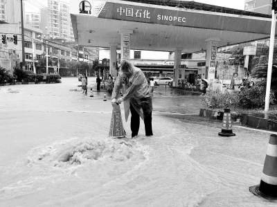 7月1日,贵州出现特大暴雨,黔南平塘平舟加油站因地处凹地,排水不畅,罐区到加油区大面积被雨水淹没。加油站员工奋力防汛,7小时后恢复营业。图为加油站员工冒雨疏通积水。莫芳璐 摄