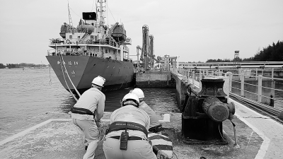 6月以来,茂名石化港口分部认真贯彻落实集团公司“不安全不生产、不安全不施工、不安全不开工”要求,全力做好疫情防控和成品油装卸船工作。6月,码头累计装卸船超100艘,成品油及化工品吞吐量近40万吨。图为6月28日码头操作工为靠泊油轮进行带缆作业。 李 劲 摄 林永胜 文