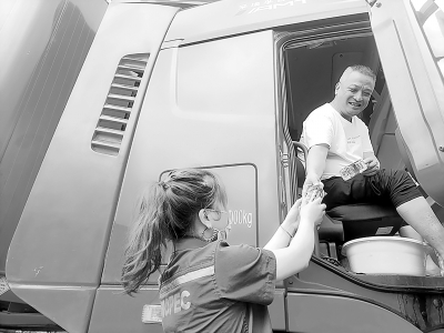 夏日炎炎,贵州贵阳白云服务区加油站组织员工为停靠服务区的大车司机送去冰冻的卓玛泉降暑解渴,获得司机师傅的高度赞扬。图为7月3日,员工为客户提供消暑服务。夏冬梅 摄