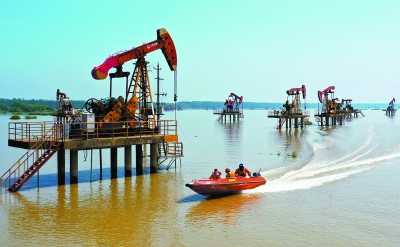 受淮河流域强降雨影响,洪泽湖三河闸7月8日开始向下游泄洪,7月12日流量达5400立方米/秒,江苏油田采油二厂所辖油区165口油井浸泡在水中。为确保原油生产平稳,他们迅速启动应急预案,加强设备巡检,随时掌握油水井生产情况,有效提高防洪防汛水平。截至目前,没有出现人为躺井和安全环保事件,油气生产平稳有序。图为油田防汛人员驾驶小艇巡回检查。陈 冬 摄