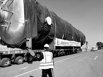 经过21天的运输,南京工程沙特乙二醇项目核心设备二氧化碳水洗塔,顺利运抵现场,成为首台走出国门运至沙特现场的700吨级设备。水洗塔是项目核心设备,运达现场后,项目部将全面开展吊装准备工作,确保8月21日水洗塔吊装就位。图为当地时间7月7日17时,工作人员在现场协调接卸工作。潘 晓 摄 李 舒 文