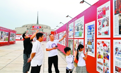 7月18日,由中国记协指导、中国新闻摄影学会联合全国主流媒体共同举办的“百年奋斗 百年答卷——庆祝建党100周年新闻摄影展”在北京中华世纪坛开幕。中国石化报以庆祝中国共产党百年华诞为主题的《我心向党》和反映基层企业抗疫的《我是党员,冲锋在前!》等两个版面,以及新闻摄影作品《听亲历者讲述“三老四严”来历》精彩亮相展览,受到广泛关注。图为观众在观看中国石化报版面。本报记者 胡庆明 摄