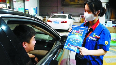 日前,面对持续高温天气,河南郑州石油响应当地政府号召,制定夜间加油优惠政策,鼓励、引导市民转变消费习惯。为做好夜间加油保障服务,他们调整油库发油时间,延长多座加油站营业时间,并为加油机配置夜间服务铃,确保车到人到服务到。此外,该公司还通过加油站液晶显示屏、海报等宣传“倡导夜间加油,减少臭氧污染”,实现夜间销量不断攀升。图为加油员向顾客介绍夜间加油优惠政策。吴 凡 摄
